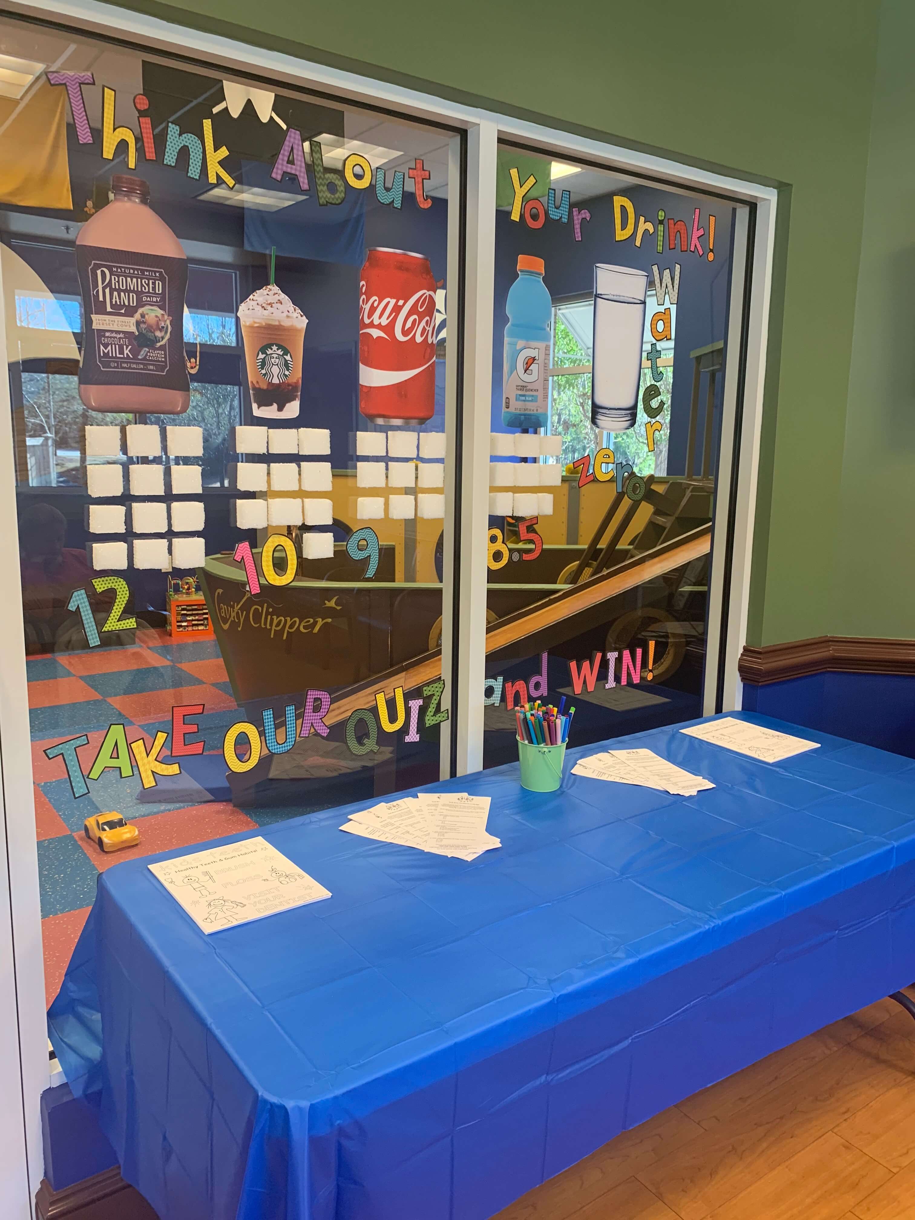 This February we are challenging your family to “Think About Your Drink!” Did you know that sipping water is one of the best things you can do for your teeth? Why? Drinking water is a great and easy way to fight tooth decay and decrease cavities. Too many kids are drinking beverages loaded with sugar. We ask parents to stick with water throughout the day and only offer juice, soda, milk, and chocolate milk with meals (or as special, occasional treat). If your children do consume the beverages mentioned above or sports drinks like gatorade, it’s always best to have a water bottle nearby to rinse the sugary substance off their teeth as soon as possible.