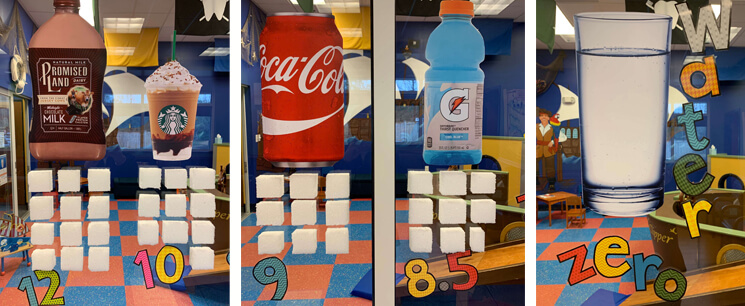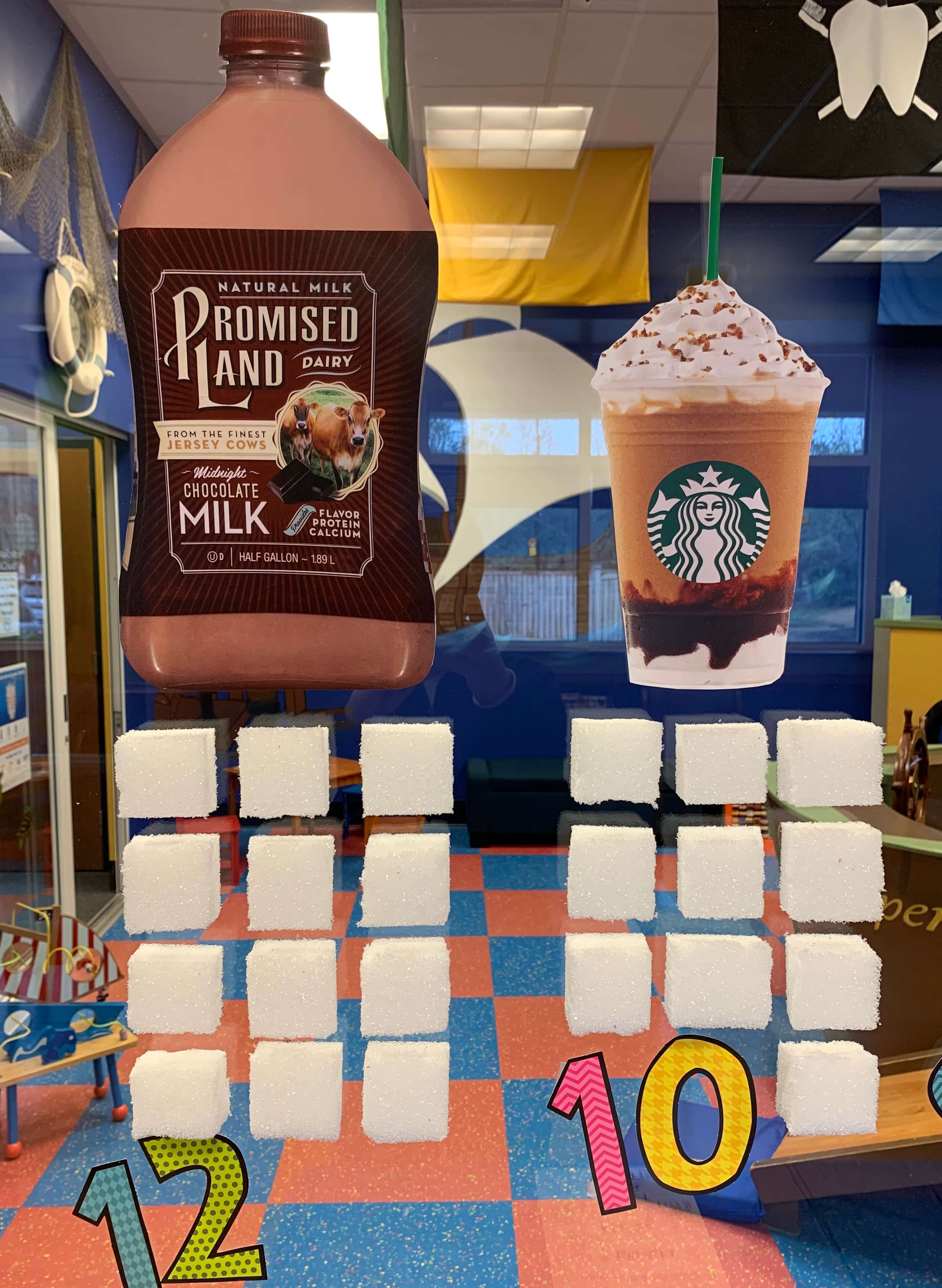 16oz Chocolate Milk – 12 tsp, 16oz Double Chocolate Chip Frappe – 10 tsp, 12oz Coke – 9tsp, 20oz Gatorade – 8.5 tsp, Water – Zero