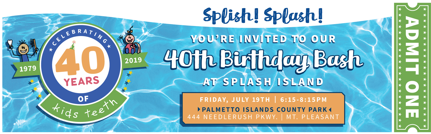 Splish, Splash join us for our 40th birthday bash! Kids Teeth is turning 40 this summer and we want to celebrate by inviting all our patients and their families to join us at Splash Island for an evening of FREE fun, food, and cake! Admission to the park and waterpark is complimentary. To enter the park bring your invitation, print a ticket, or stop by our offices to grab a few. Also, be sure to follow us on Facebook as we countdown 40 days until we celebrate turning 40 – you don’t want to miss the doctor’s party announcement!